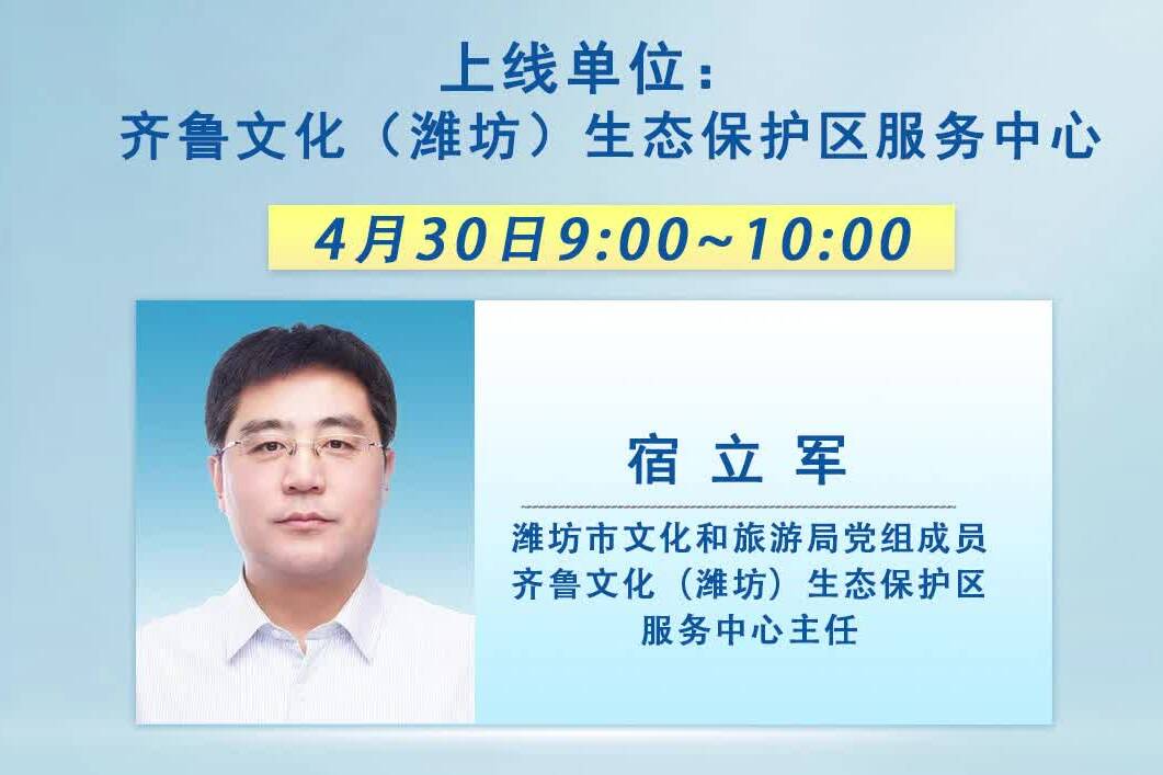 4月30日上午9:00~10 00,濰坊市文化和旅游局黨組成員、齊魯文化(濰坊)生態(tài)保護(hù)區(qū)服務(wù)中心主任宿立軍將走進(jìn)市融媒體中心新聞廣播《政策訪談》欄目直播間,敬請(qǐng)關(guān)注!